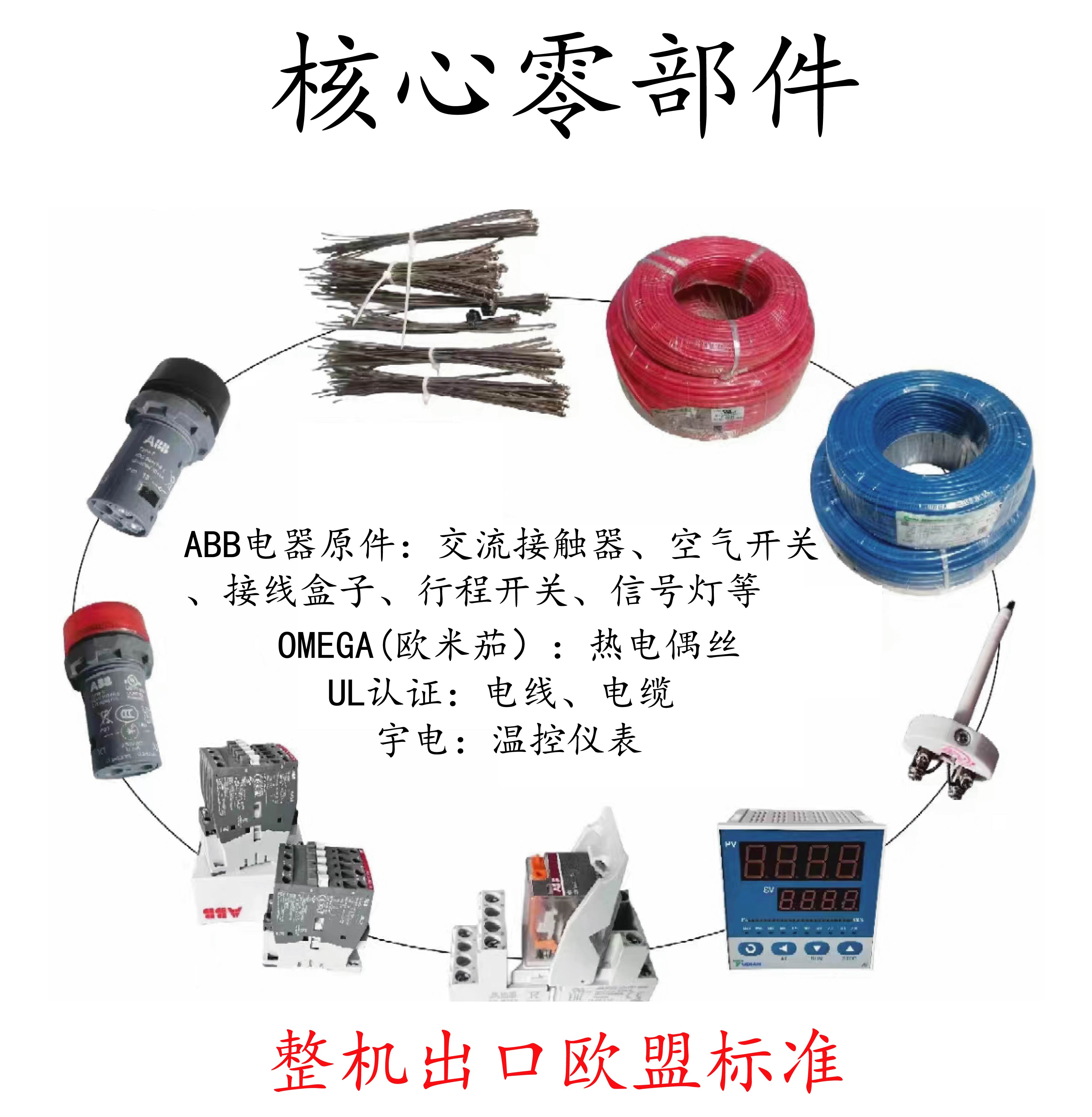 認證標準及核心零部件 | ?整機核心部件均符合CE、UL、MET等認證標準;核心零部件有ABB電器元件,UL認證電線、電纜,歐米茄,宇電、歐陸儀表等。 | |